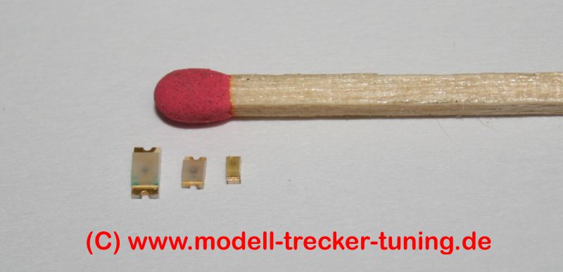 SMD-LEDs im Vergleich: Links: Typ 1206 / Mitte: Typ 0805 / Rechts:Typ 0603 |